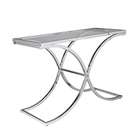 The contemporary elegance of this sofa table will bring a pleasantly distinct style to your home. The metal frame is finished in brilliant chrome that will add a -inchwow-inch factor to your home. The base of this sturdy table consists of a curved -inchX-inch which supports the solid top frame with inlaid glass. This elegant table can be used to achieve a formal atmosphere or a casual contemporary home setting; 44-inch W by 18-inch D by 30-inch H; Chrome finish with clear glass top; Durable metal frame construction; Tempered glass top; Assembly required